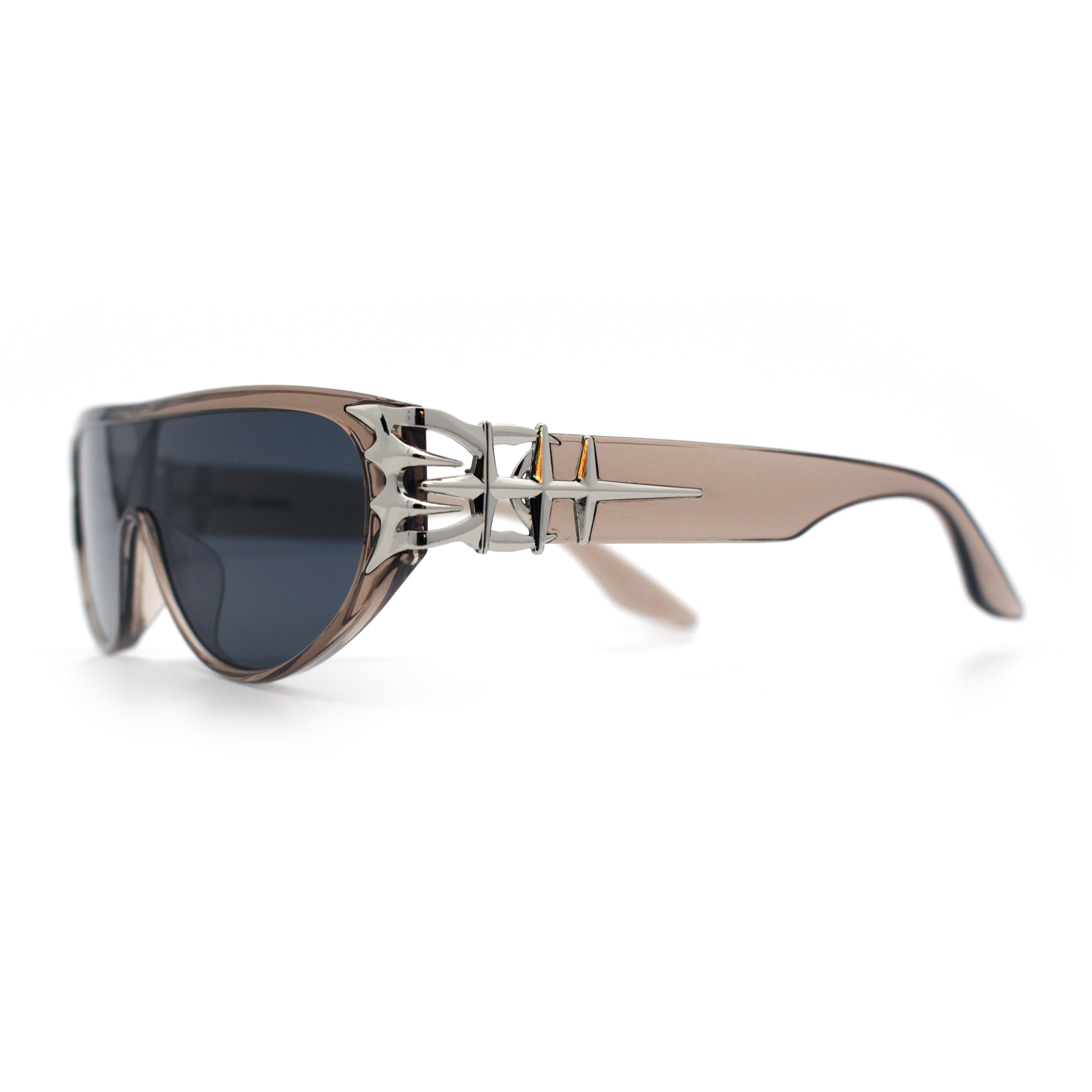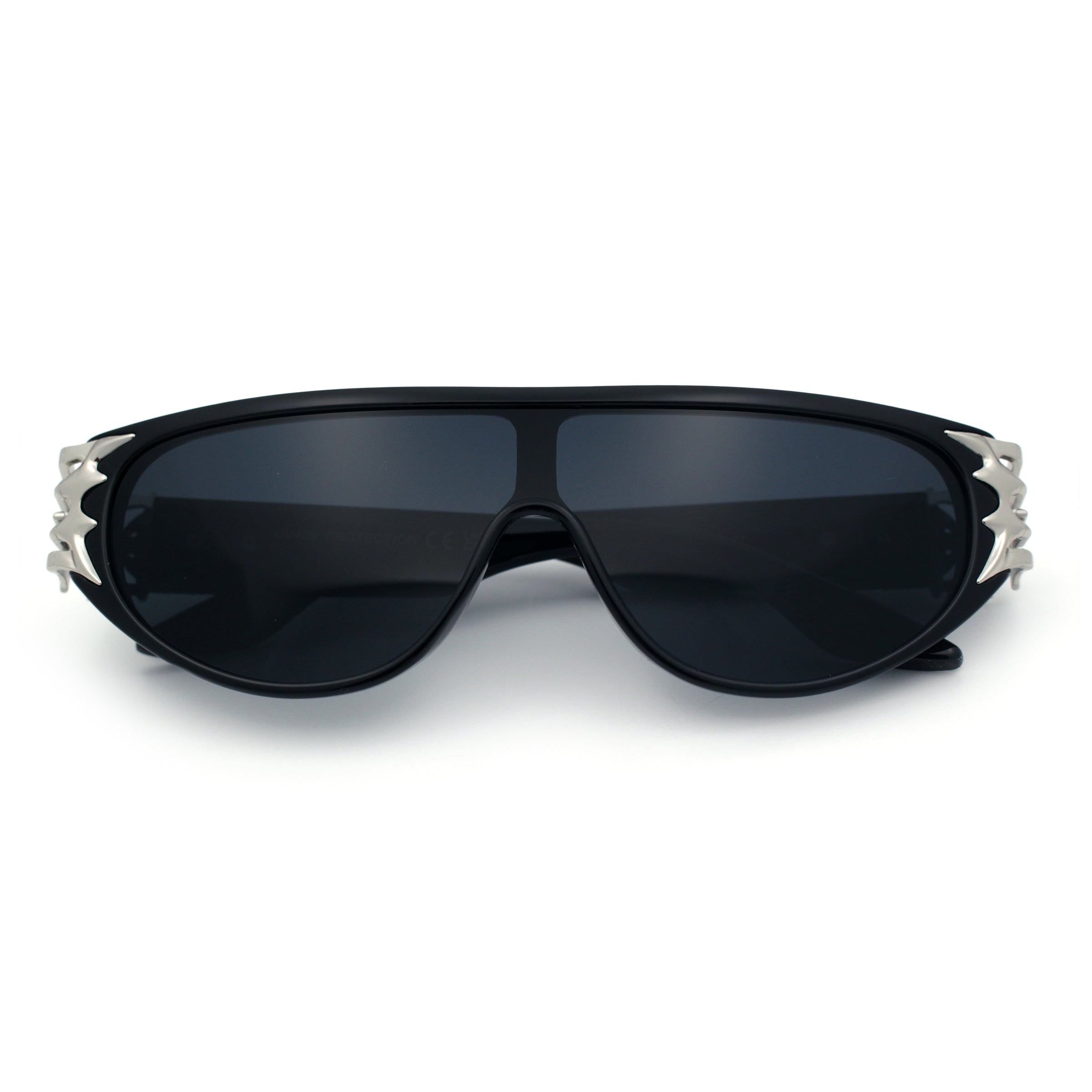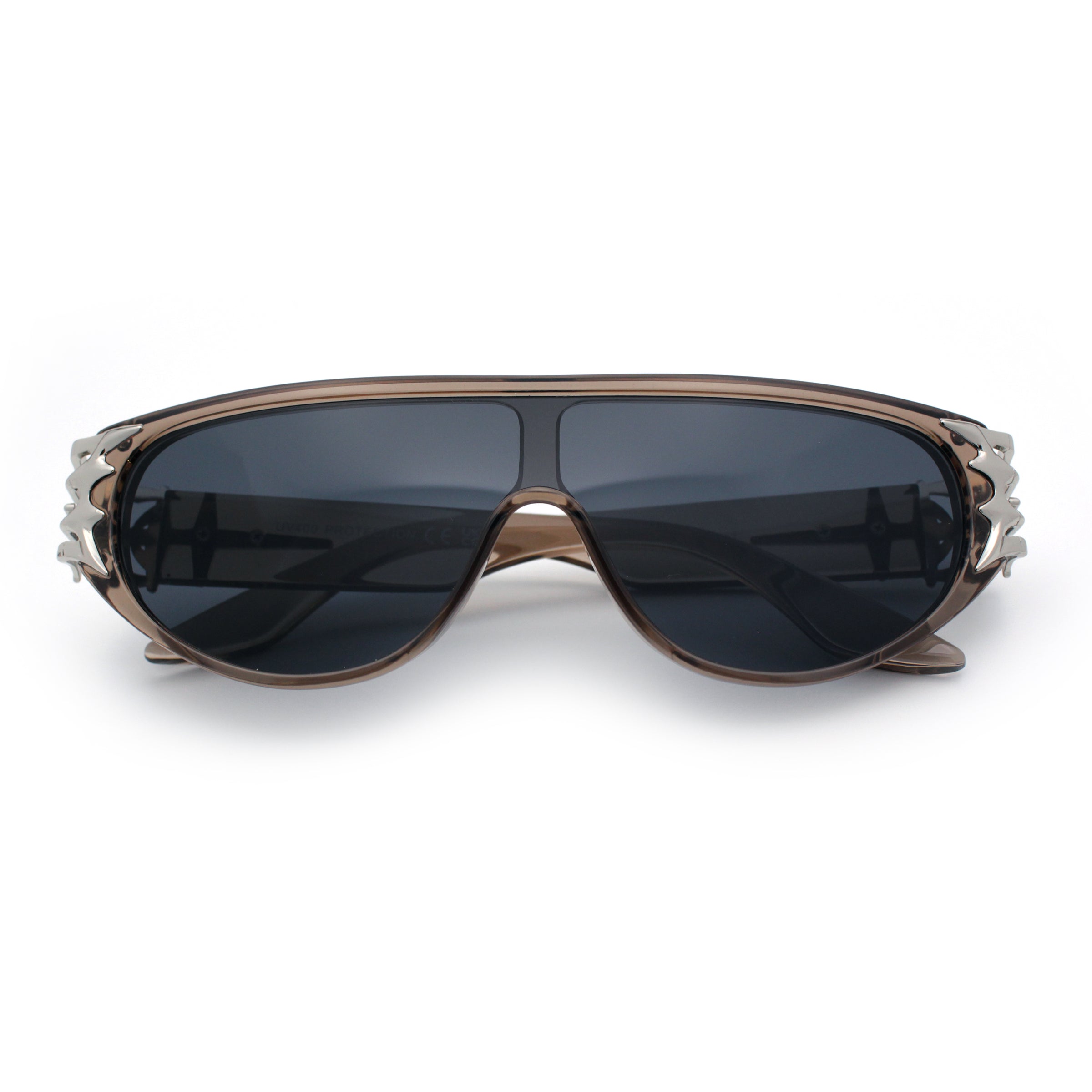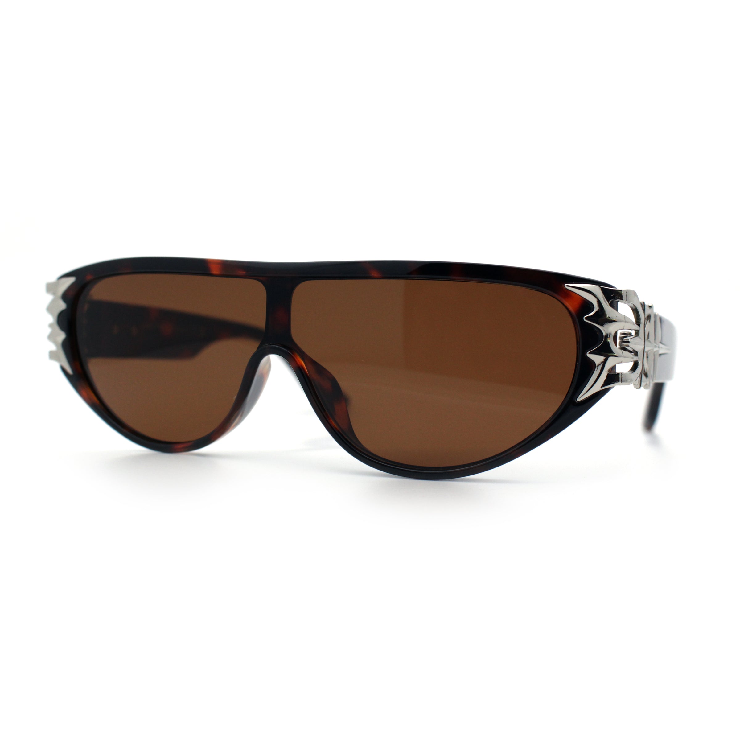 Super hard diva vibe fancy plastic frame rectangular shield sunglasses for urban fashionista! These bold gaudy elaborate bling hinges will settle nicely with trendy urban goth fashion. Made with 100% UV400 polycarbonate lenses fitted in a plastic frame. (d273)