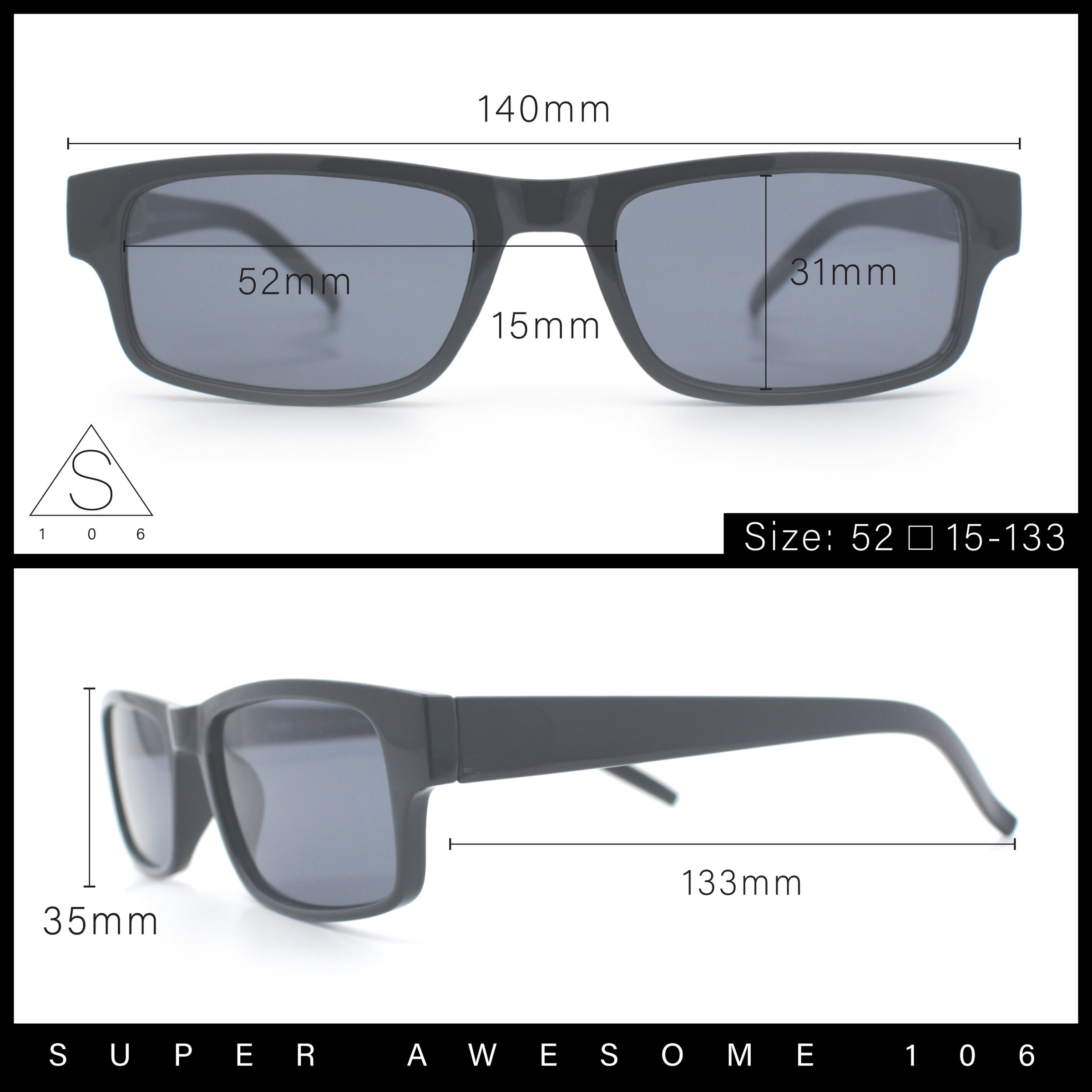 - Lens Width: 52mm / Lens Height: 31mm / Bridge Width: 15mm / Temple Length: 133mm