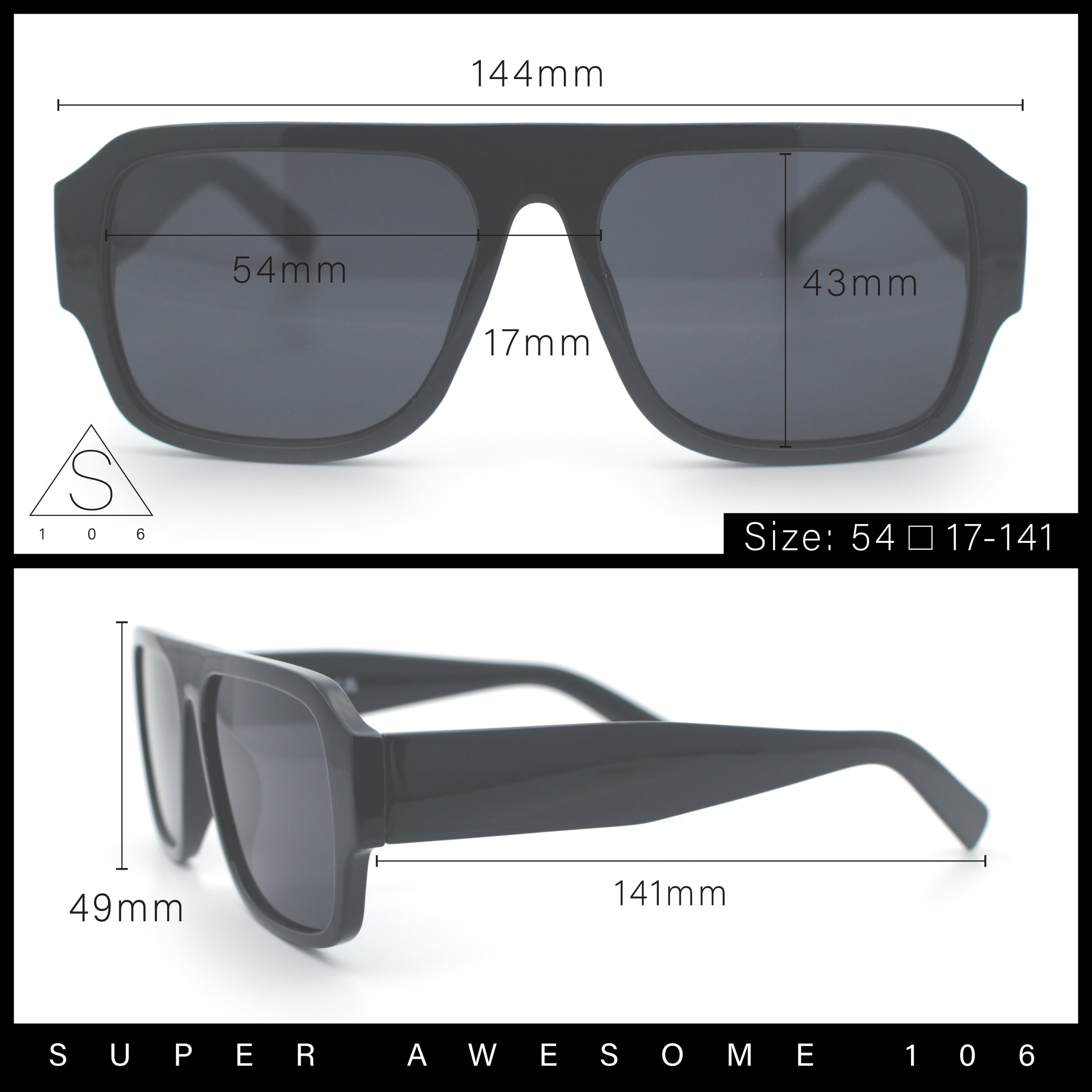 - Lens Width: 54mm / Lens Height: 43mm / Bridge Width: 17mm / Temple Length: 141mm