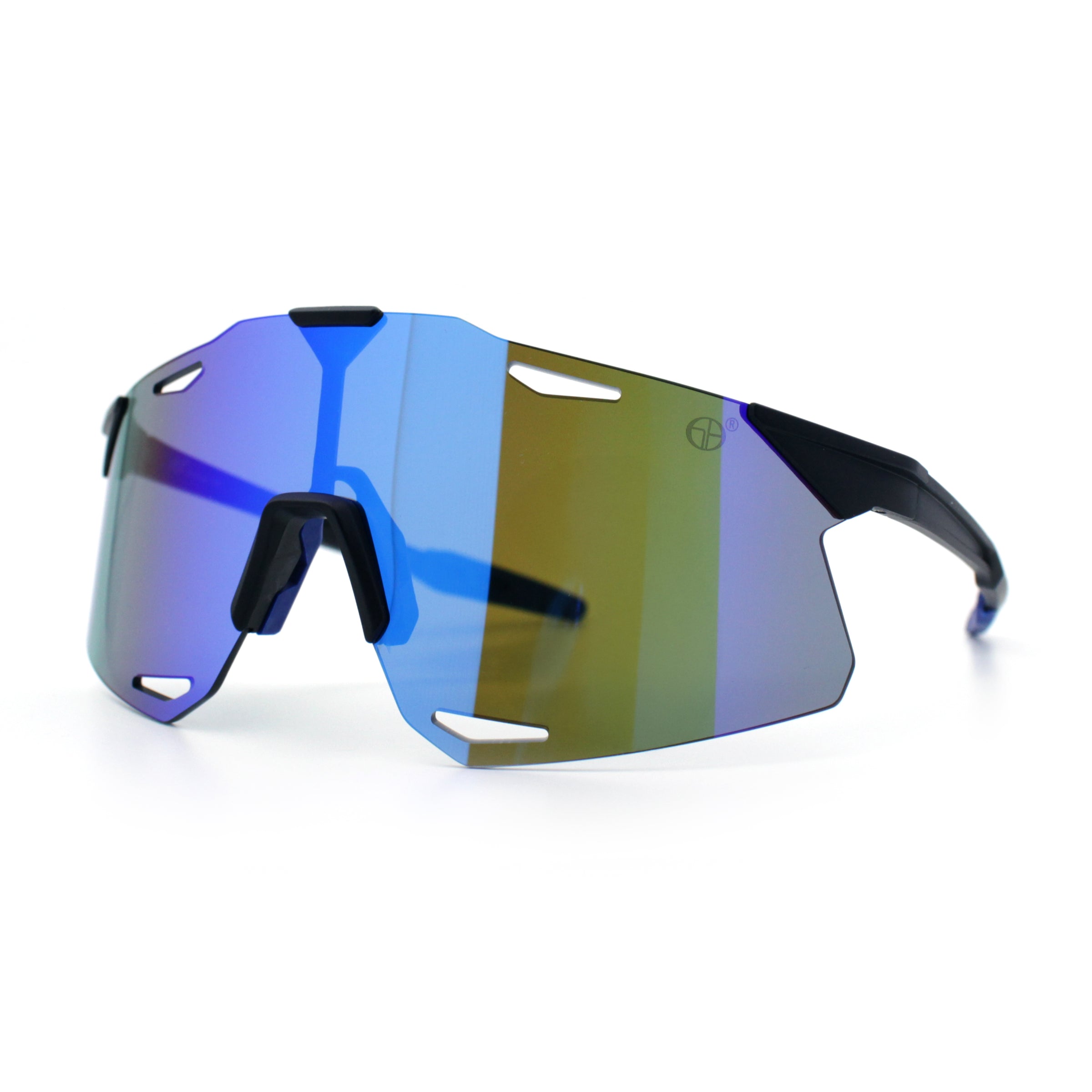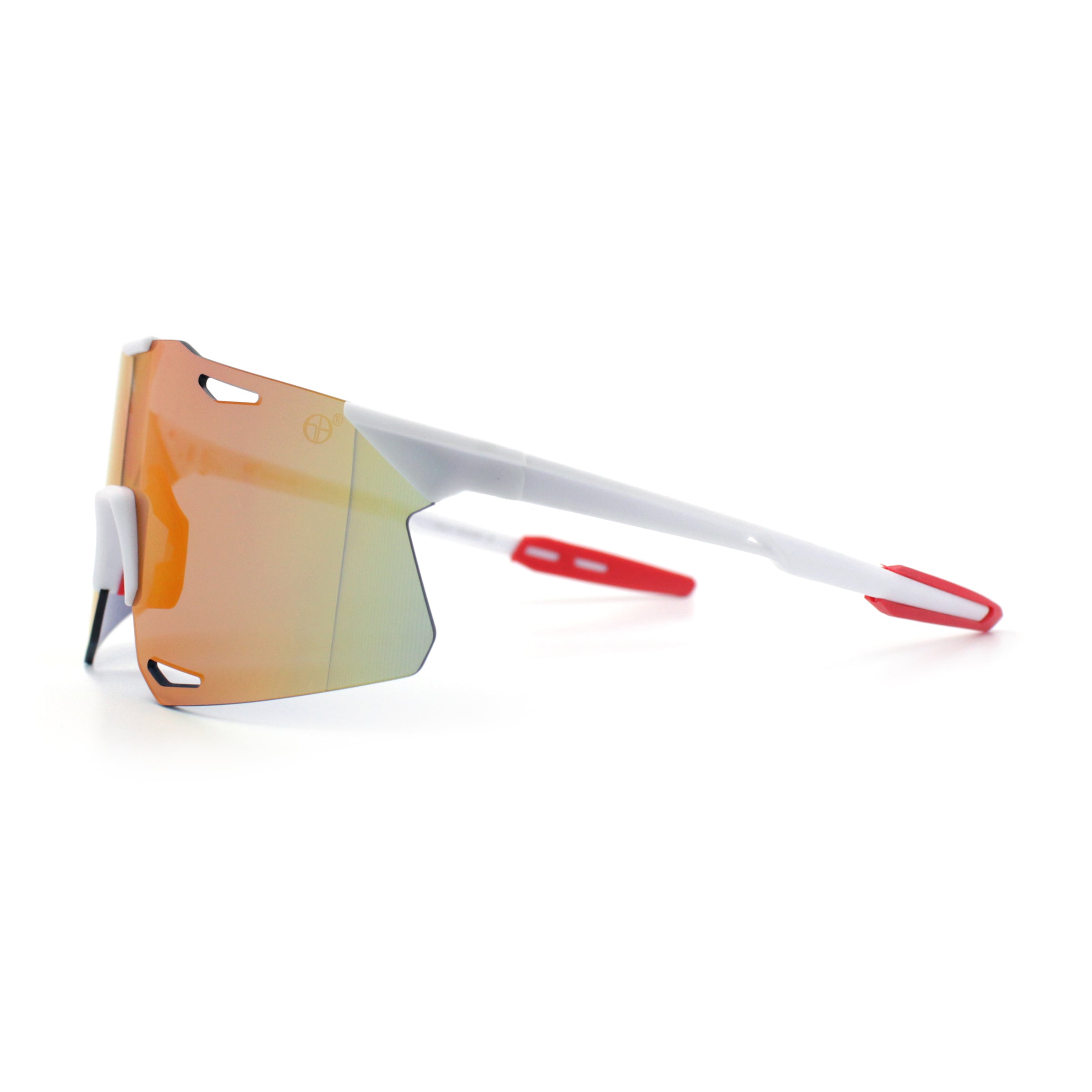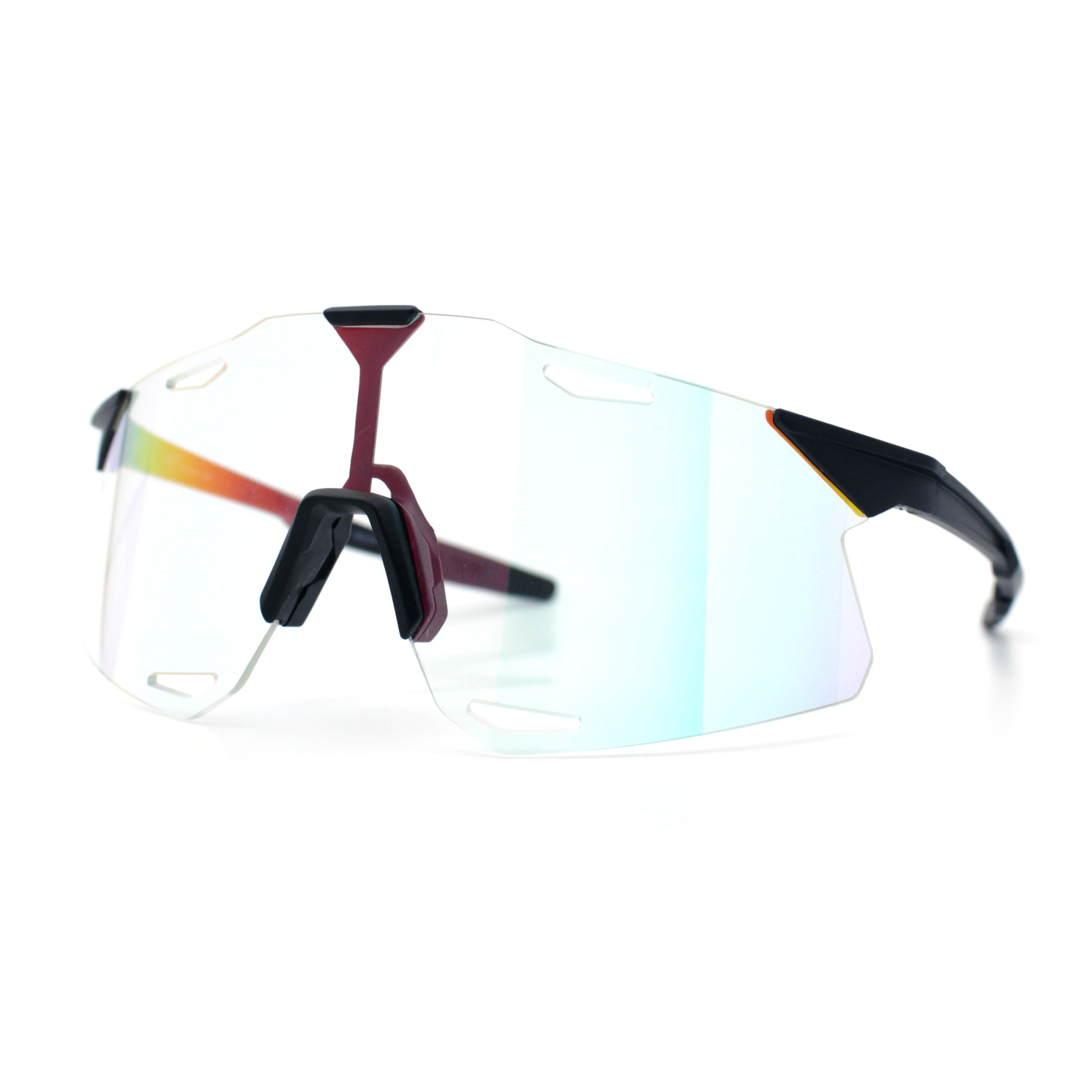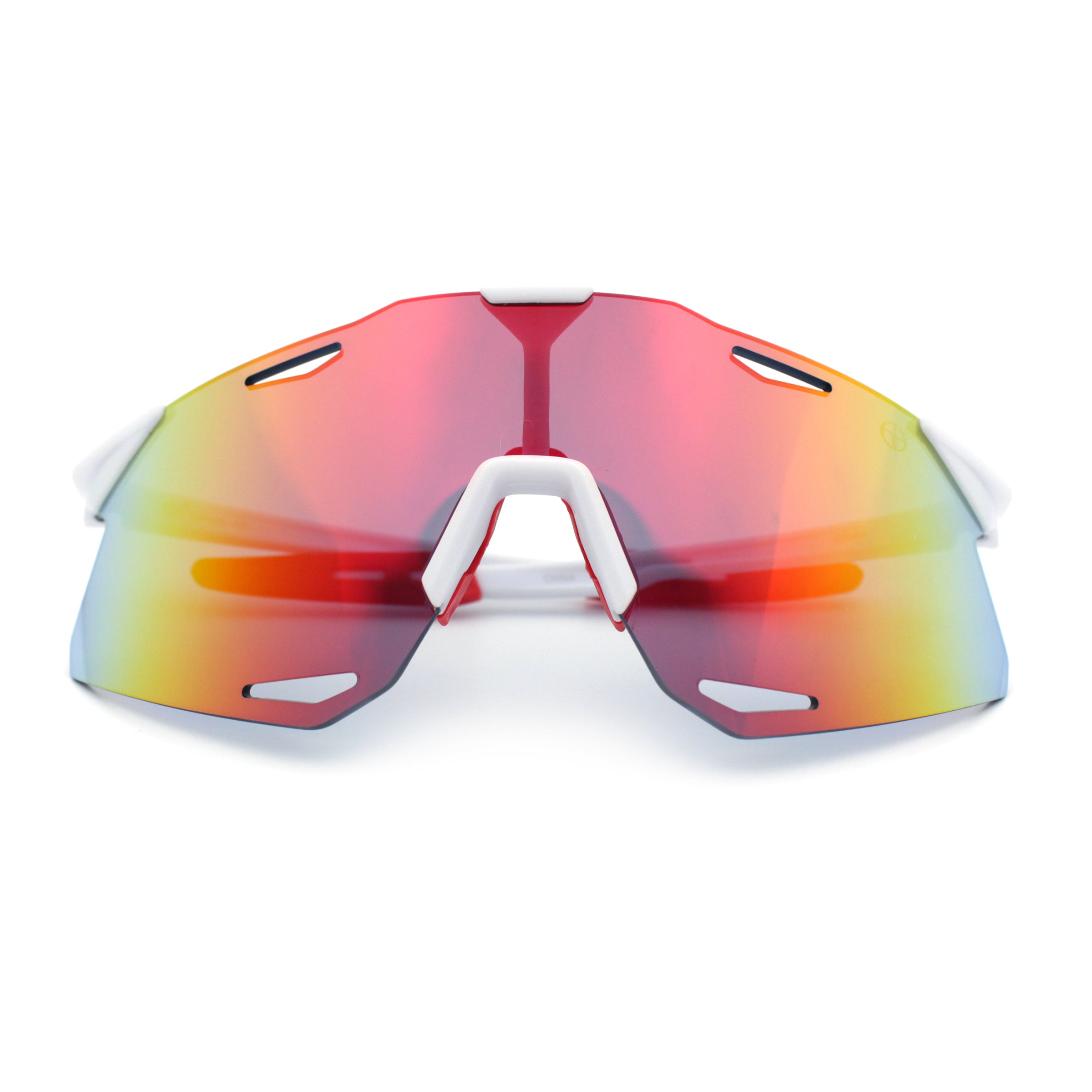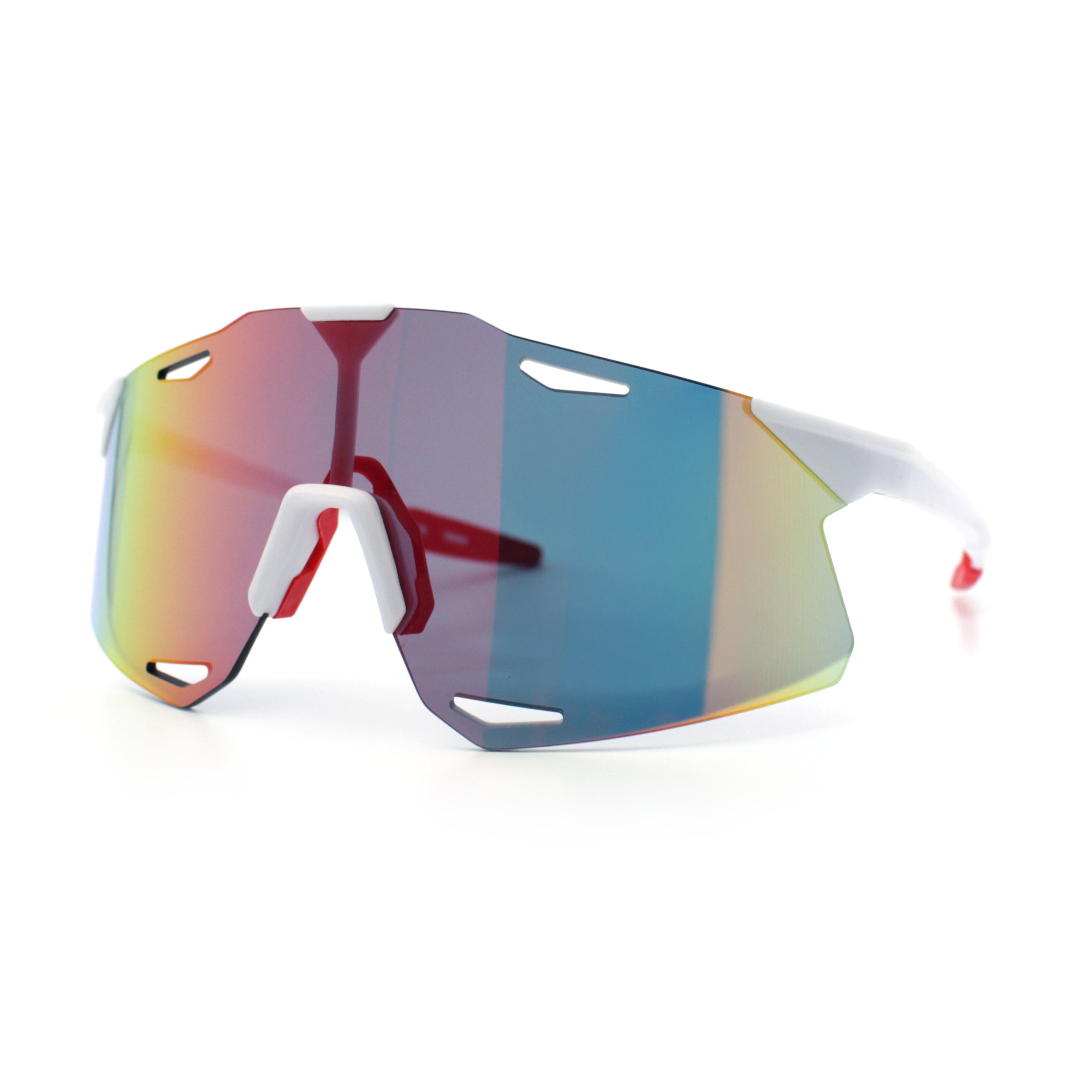 These classic large coverage rimless shield sunglasses are perfect for outdoor sports and recreation. The premium, shatterproof, colored mirror, and 100% UV400 polycarbonate lenses provide optimal performance while the super lightweight wrap-around design offers a bold, runner style and athletic look. The sophisticated pop color mirror options add a sportsman's edge. (d253)