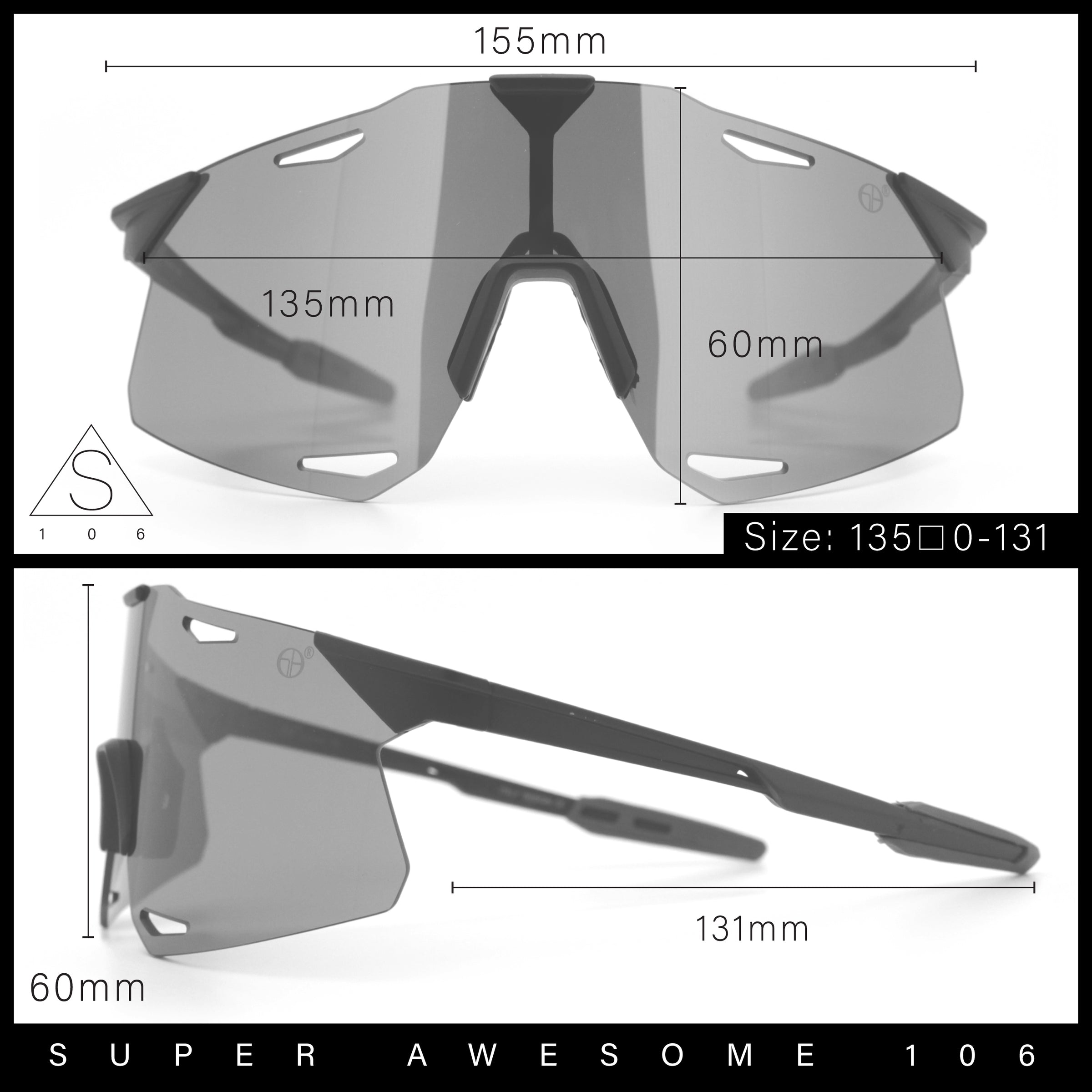 - Lens Width: 135mm / Lens Height: 60mm / Bridge Width: 0mm / Temple Length: 131mm