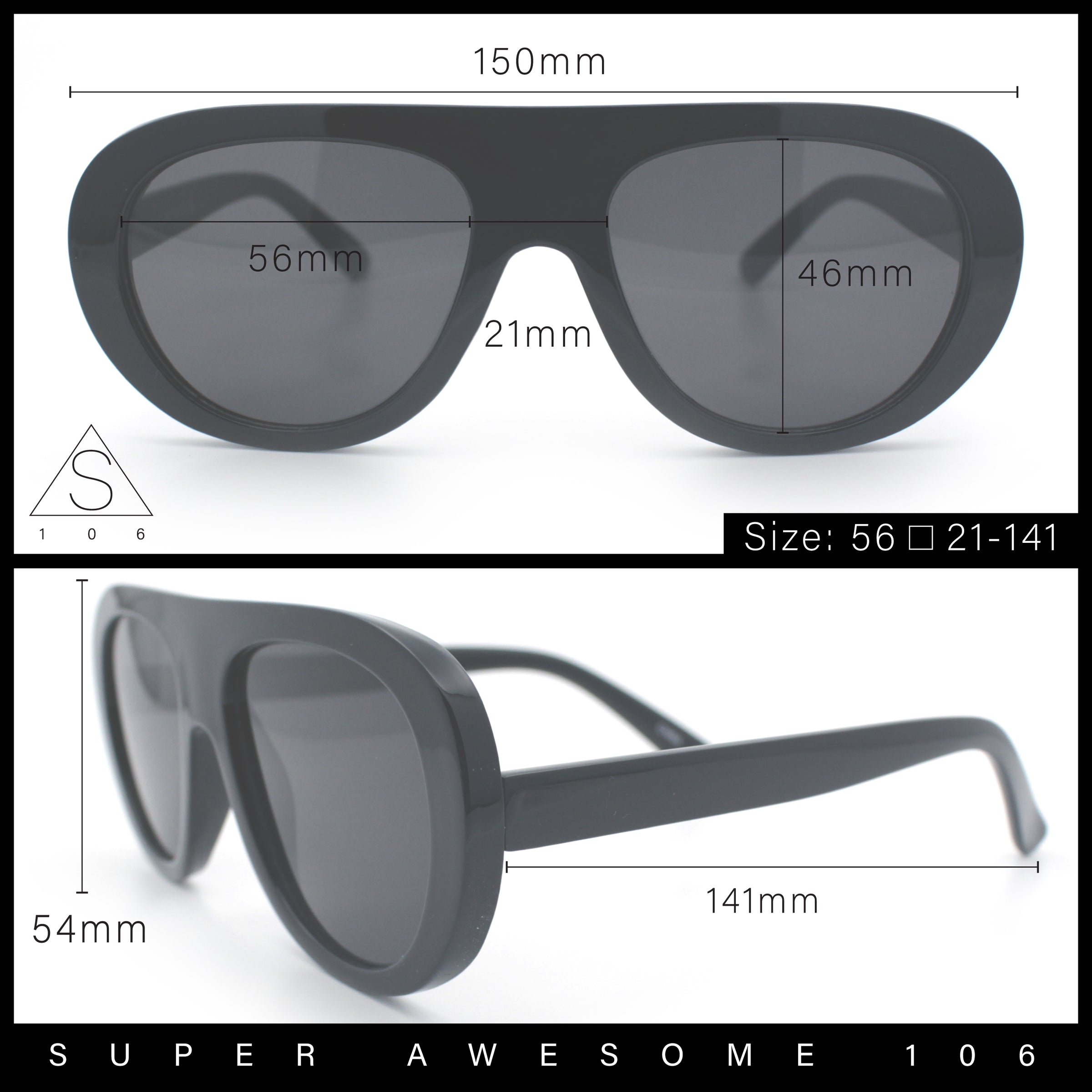 - Lens Width: 56mm / Lens Height: 46mm / Bridge Width: 21mm / Temple Length: 141mm