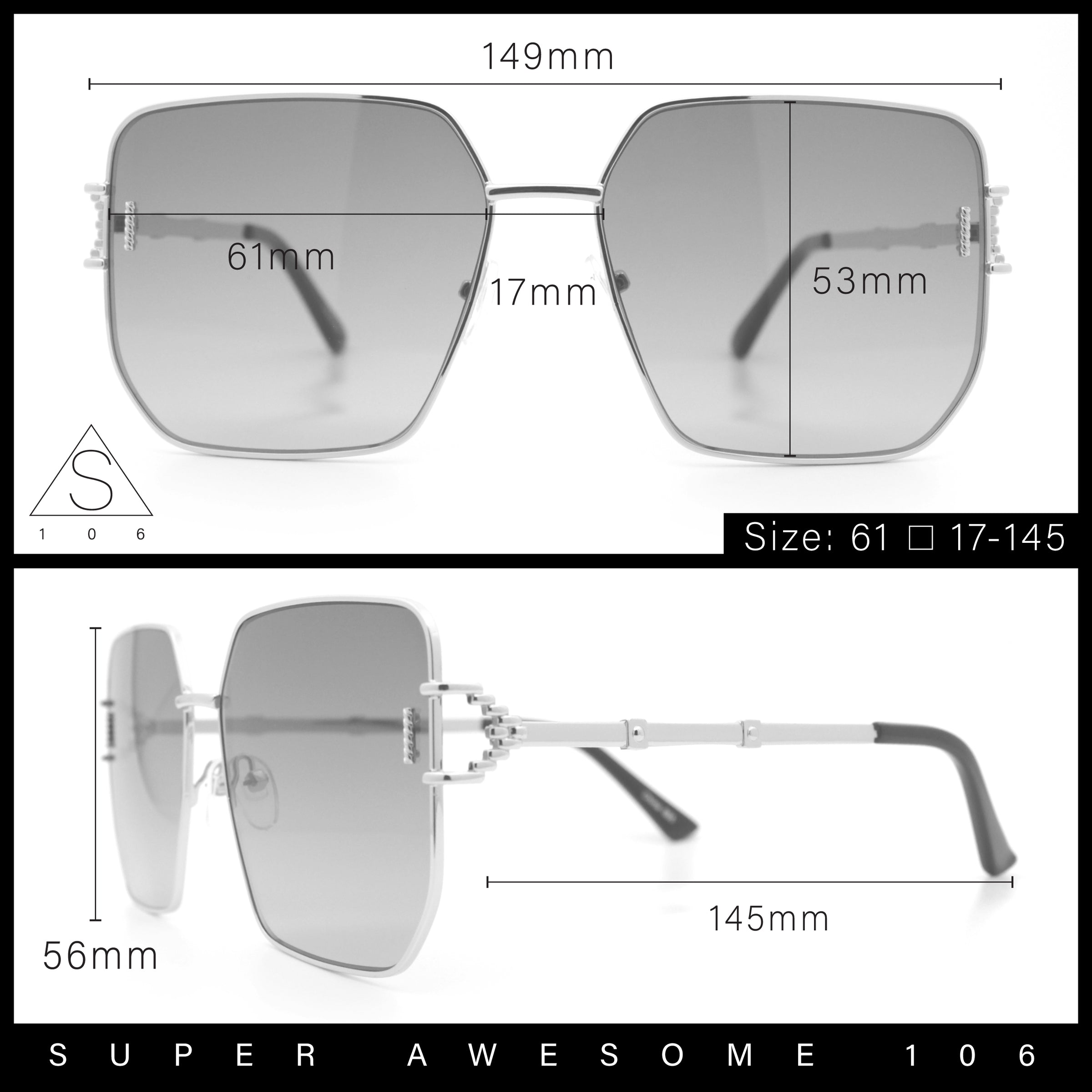 - Lens Width: 61mm / Lens Height: 53mm / Bridge Width: 17mm / Temple Length: 145mm