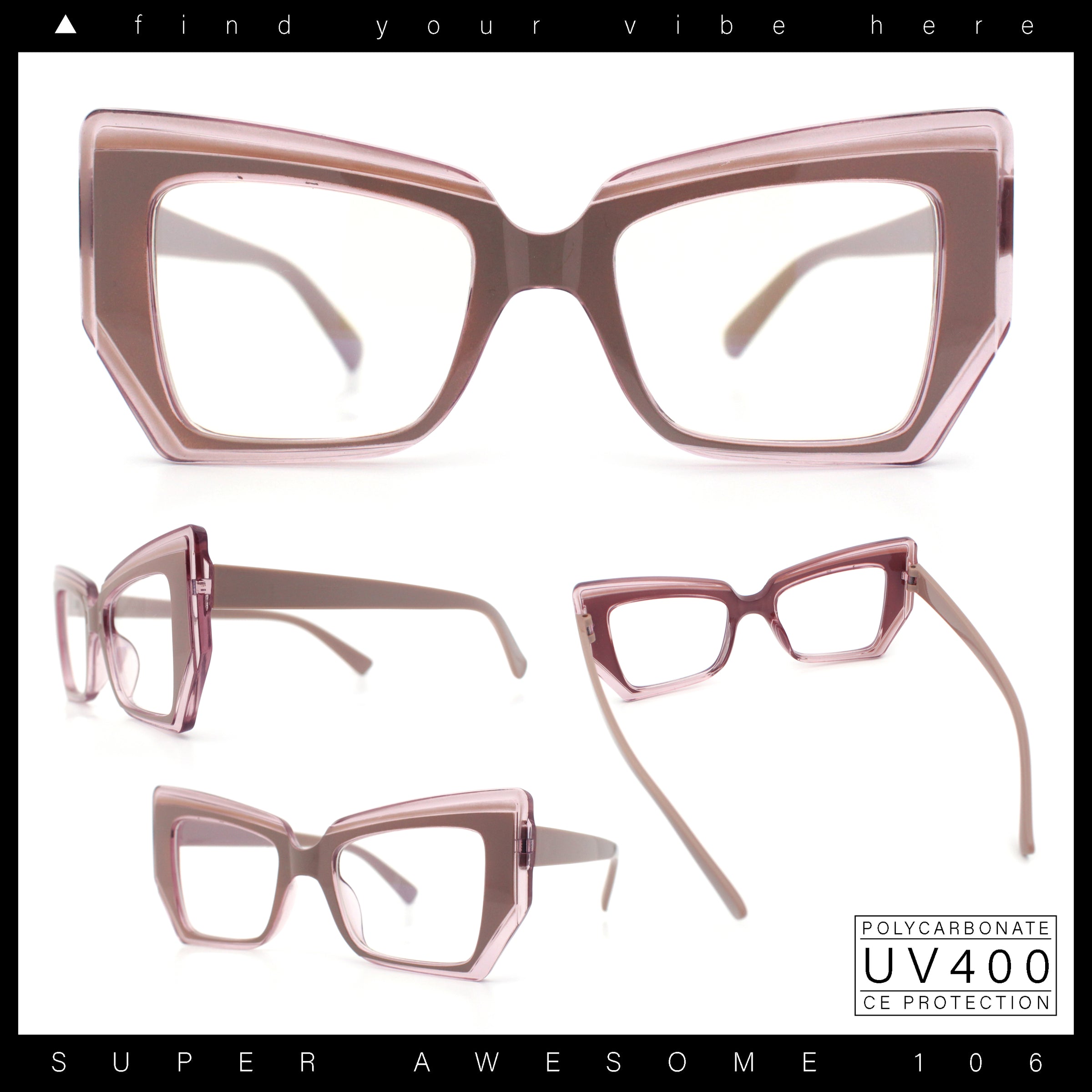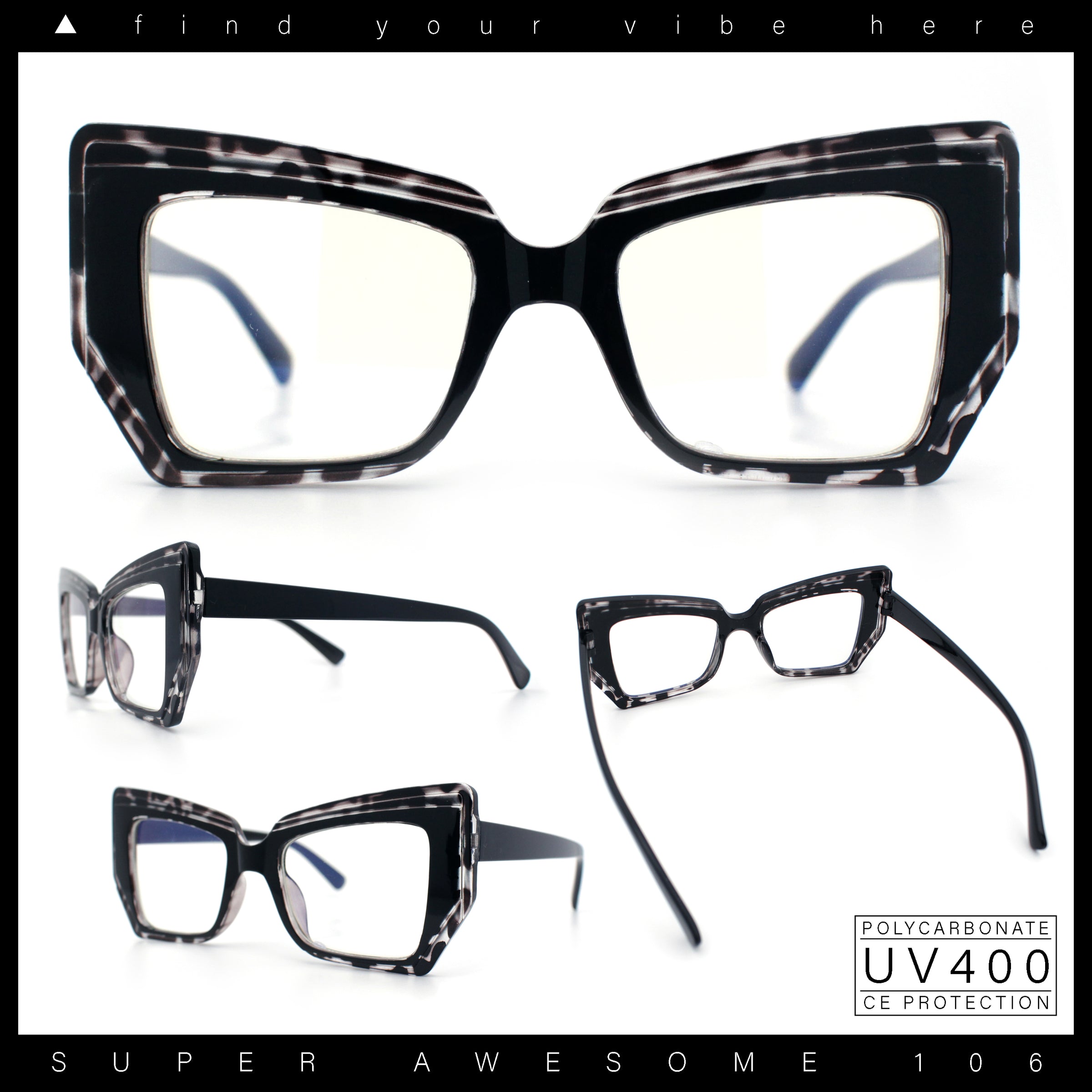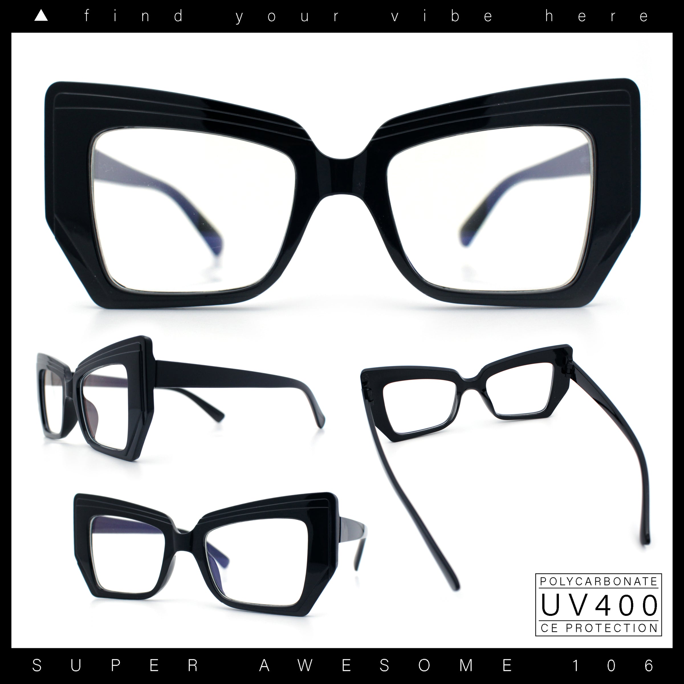 These iconic oversized pinup style plastic rim cat eye silhouette clear lens fashion glasses are perfect for complementing any casual everyday chic look. The trendy generous sizing and large coverage make them super versatile. They are made with a metal based frame, metal hinges, and UV400 polycarbonate lenses. (d256)