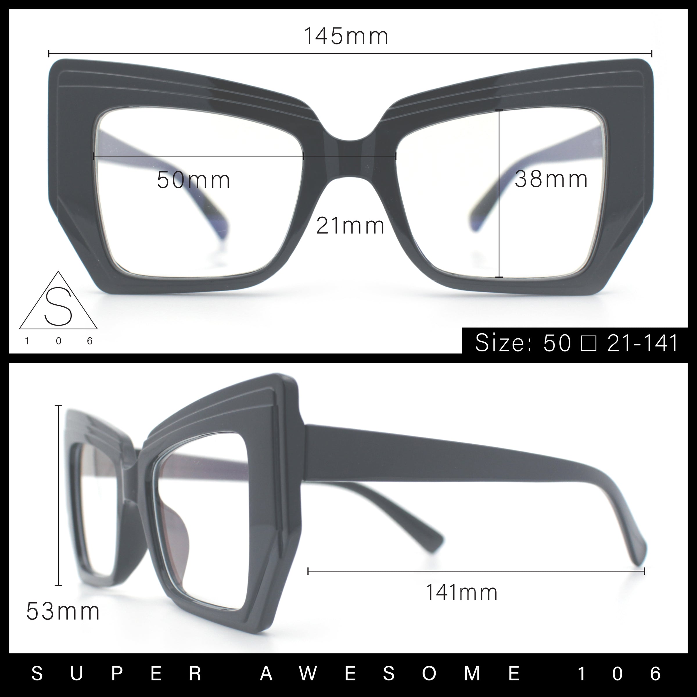 - Lens Width: 50mm / Lens Height: 38mm / Bridge Width: 21mm / Temple Length: 141mm