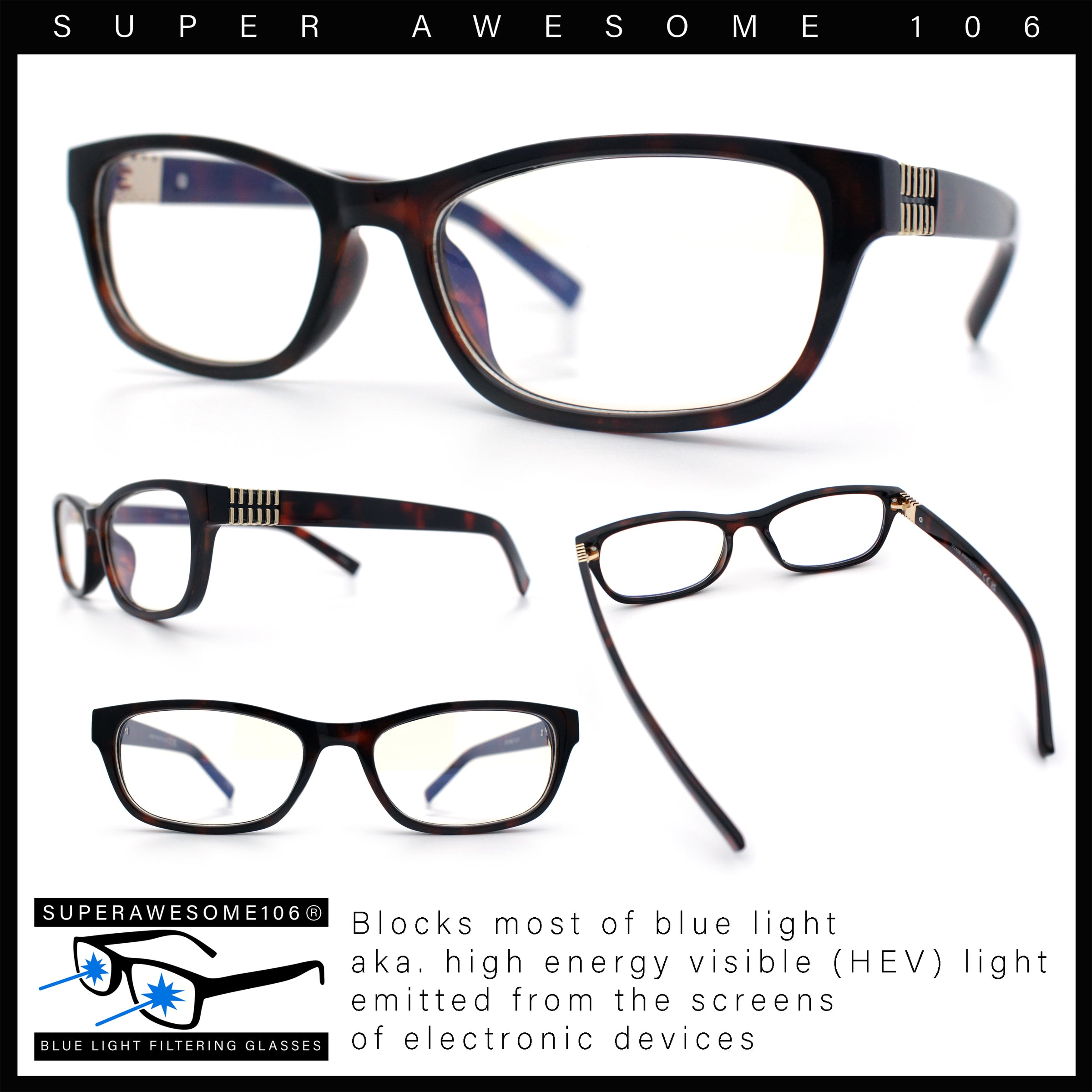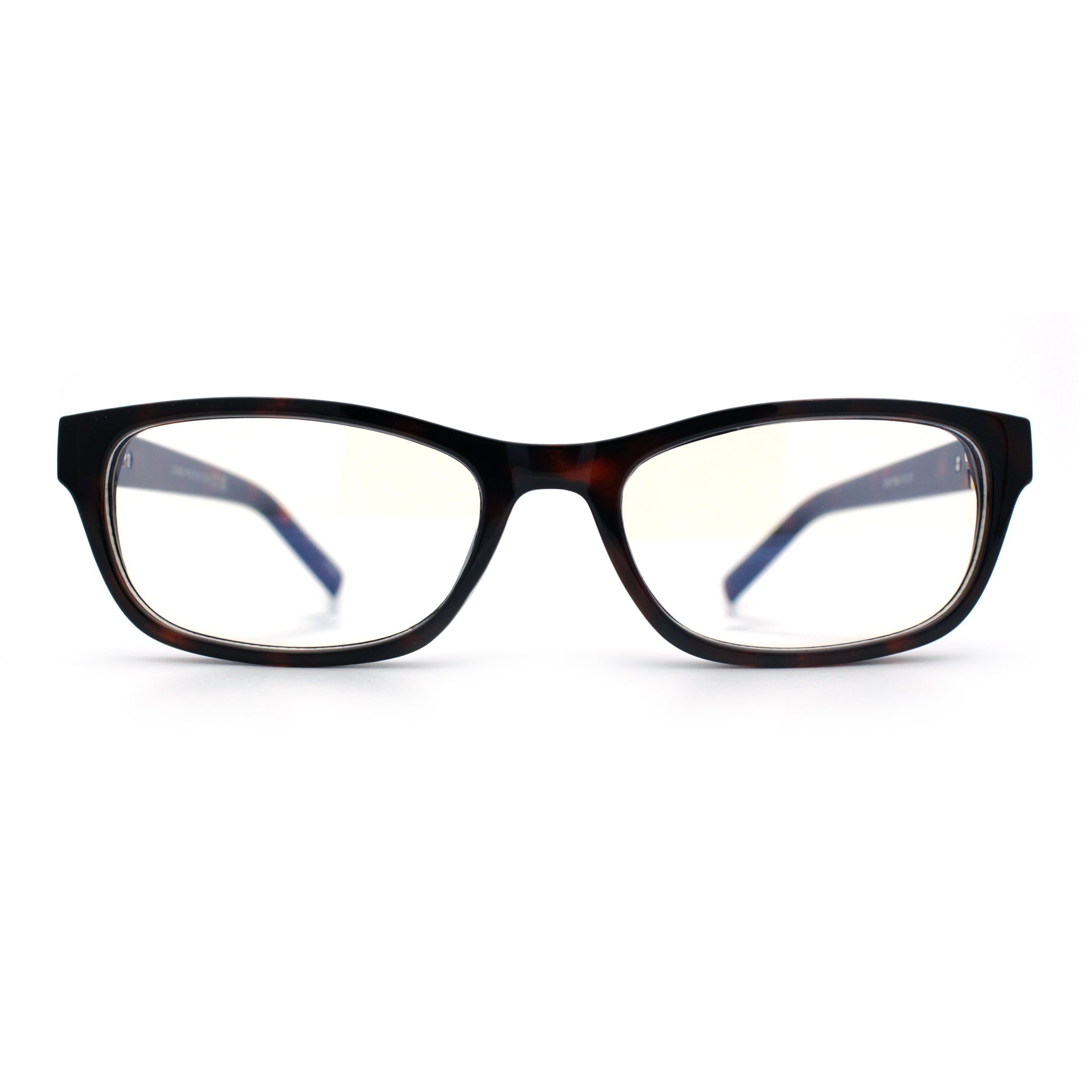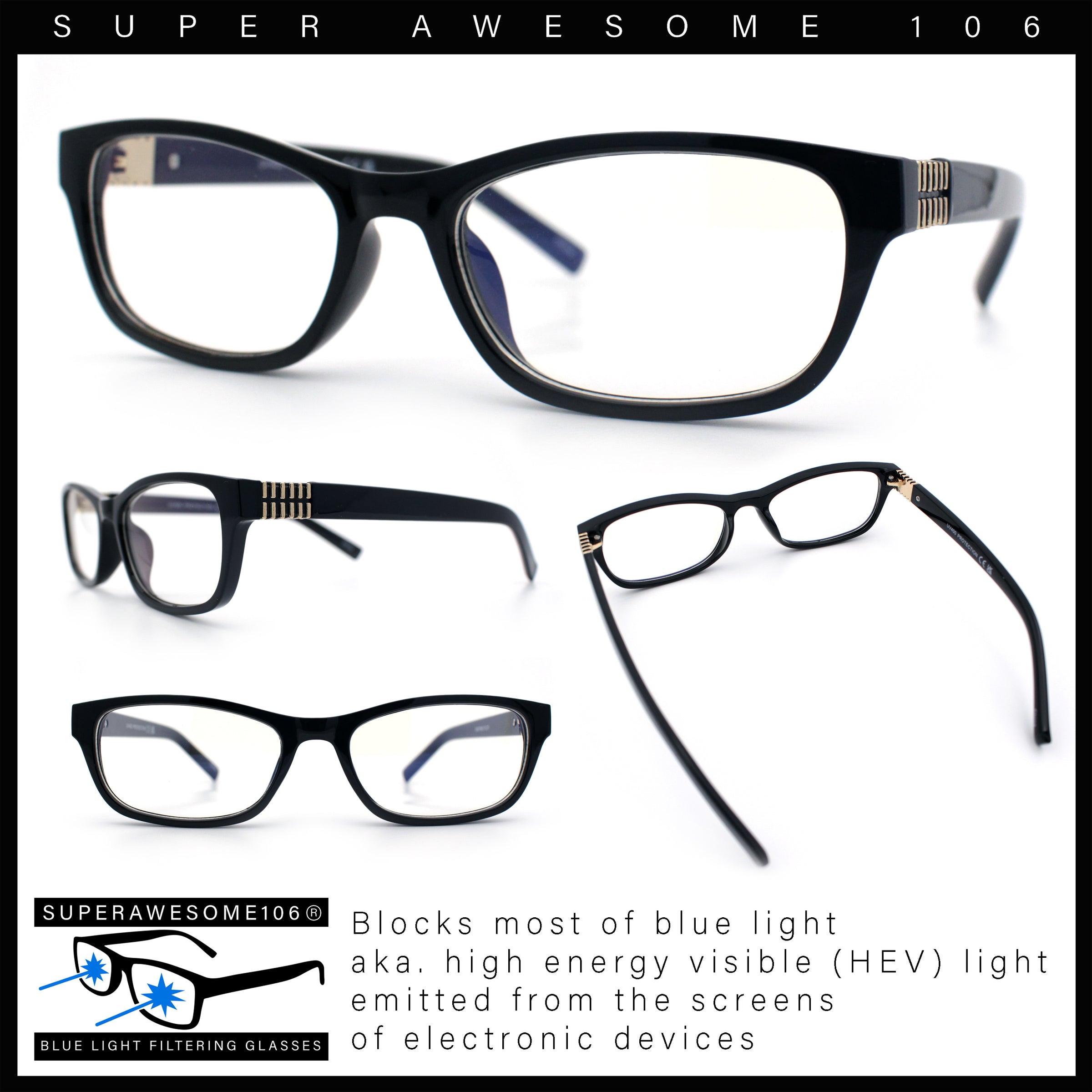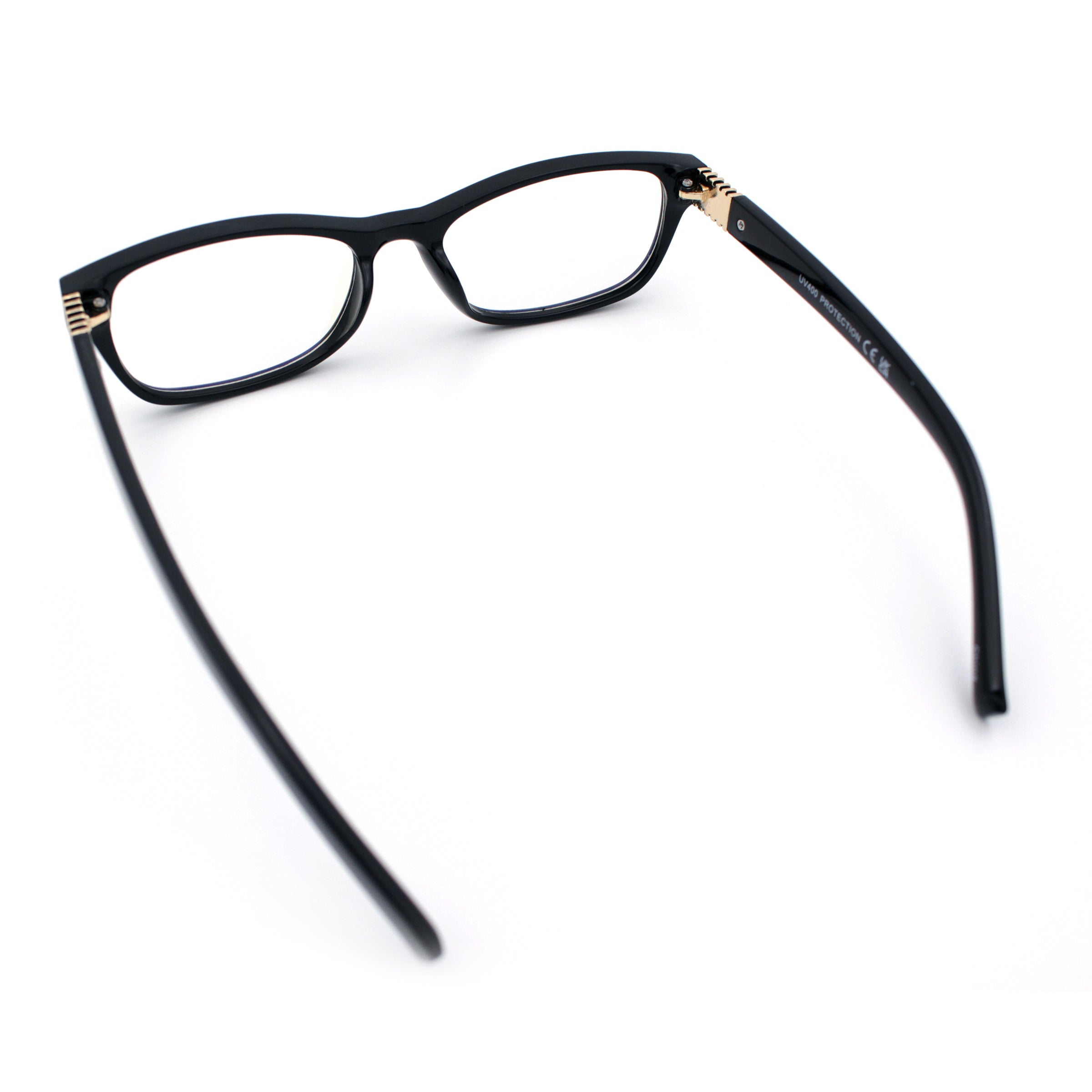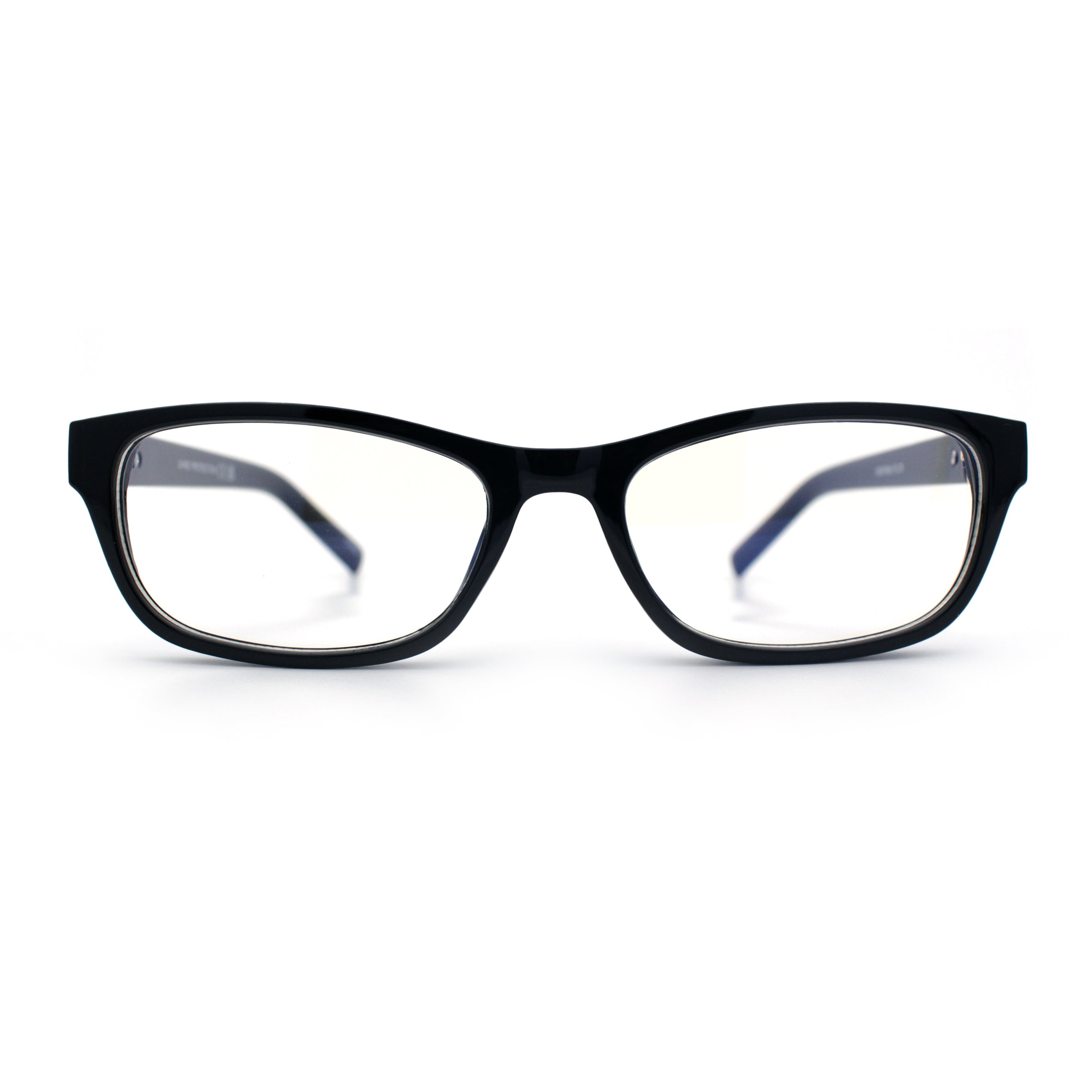 These classic narrow rectangle plastic clear lens blue light filtering glasses are perfect for complementing any fashionista with their screens and devices. The classy contemporary sizing and silhouette make them timeless and elegant. They are made with a plastic based frame, metal hinges, and ultra blue violet ray filtering polycarbonate (UV400 rated) computer lenses. These glasses will protect your eyes from the harmful effects of blue light from screens while also looking great on you. (d169)